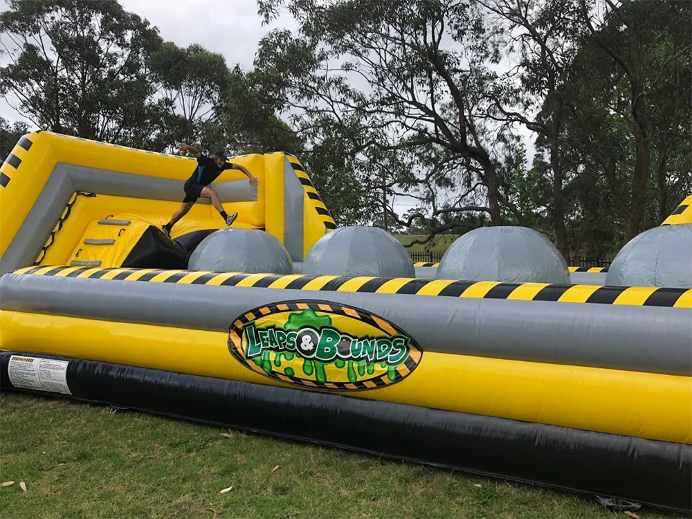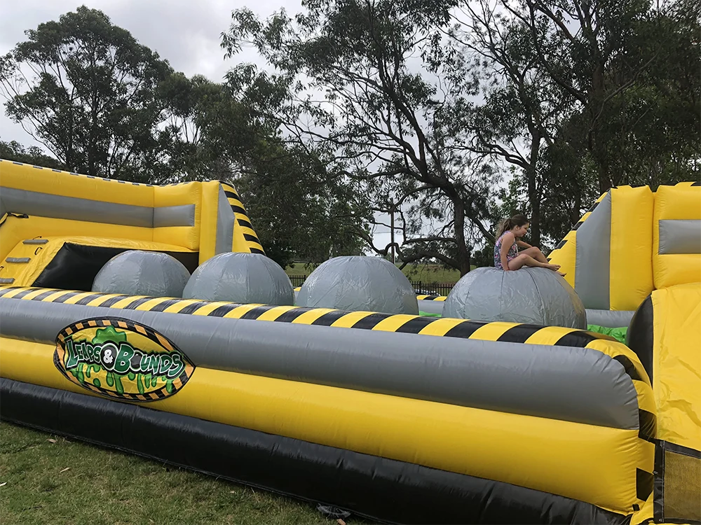 Have you ever seen Wipeout or Ninja Warrior on TV and thought, ‘I can do that, easy?’ Well now it’s time to test that theory and your skills…and beware, this sports game takes no prisoners with the Toxic inflatable slime to avoid below. The Big Baller is a fun filled challenge where each player climbs up to the inflatable platform to take on the feat of leaping across the 4 big balls to avoid a fall into the toxic waste. The objective of the game is to see if you can make it across all four without losing balance and wiping out. The fun of this game being – how difficult that task actually is, and the longer you stop on each ball to get your balance makes it even harder! This is a great and entertaining game of speed and agility to make it across before falling off. Surrounded by the Zero Shock fall bag it doesn’t matter if you cant quite make it, there’s a soft landing ahead. The Big Baller Wipeout is the perfect addition to the next party, school event or fair, presentation day or corporate team challenges, and it is equally entertaining for the onlookers who will laugh and cheer you on!