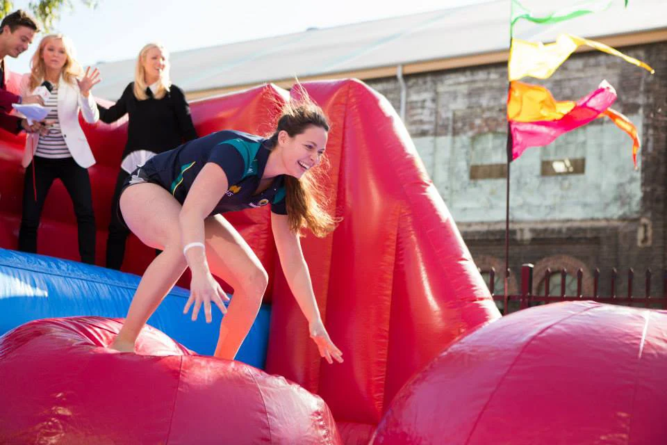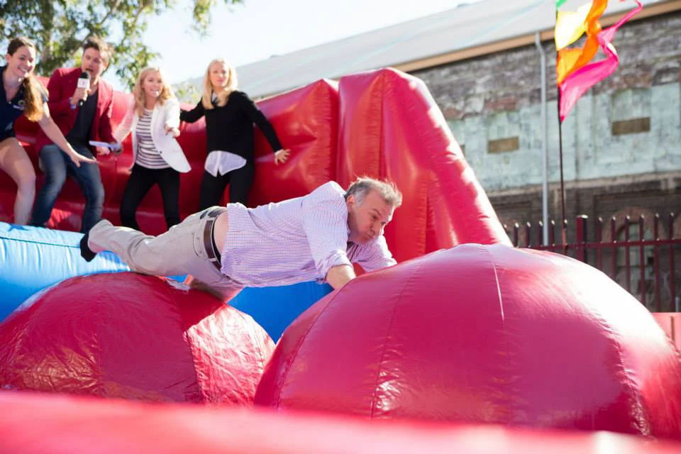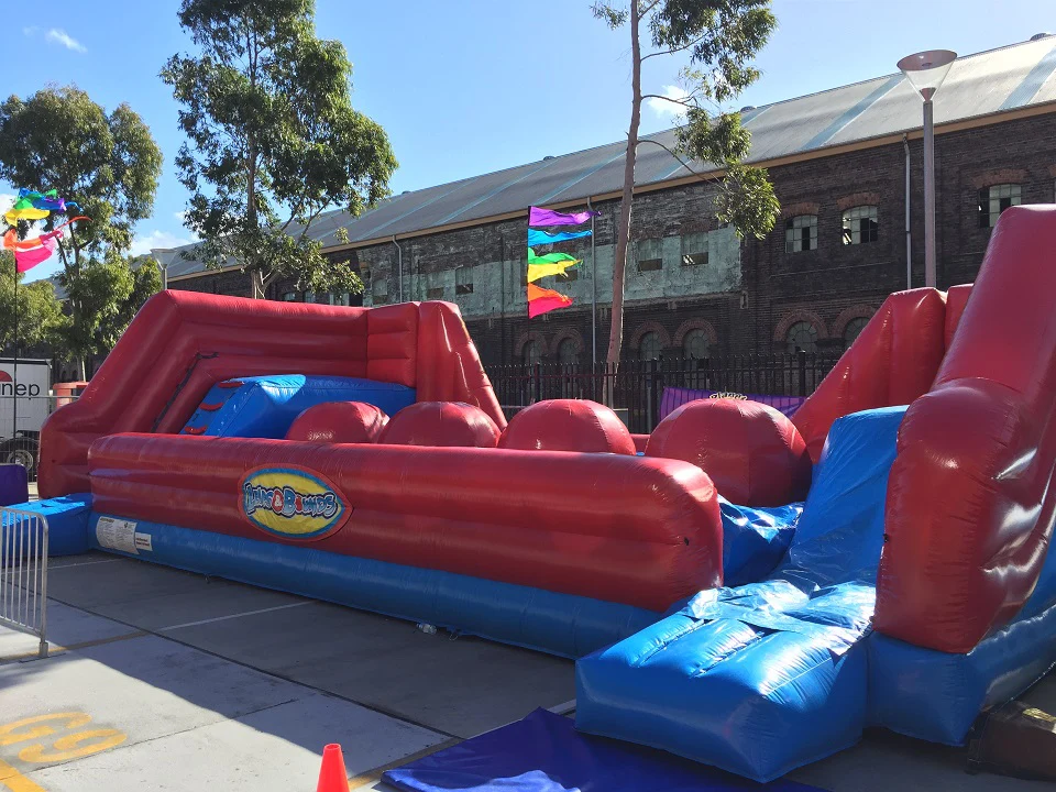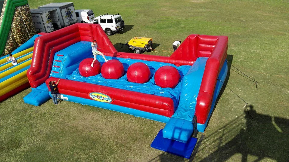 As seen on the Sydney Telethon, the Big Baller Wipeout is the closest you can come to the Tv Show WIPEOUT here in Sydney... Well now it’s time to test that theory and your skills…and beware, this sports game takes no prisoners. The Big Baller Wipeout is a fun filled game where each player climbs up to the inflatable platform to take on the challenge of leaping across the 4 big red balls. The objective of the game is to see if you can make it across all four without losing balance and wiping out. The fun of this game being – how difficult that task actually is! This is a great and entertaining game of speed and agility to make it across before falling off. Surrounded by the Zero Shock fall bag it doesn’t matter if you cant quite make it, there’s a soft landing ahead. The Big Baller Wipeout is the perfect addition to the next party, school event or fair, presentation day or corporate team challenges, and it is equally entertaining for the onlookers who will laugh and cheer you on!