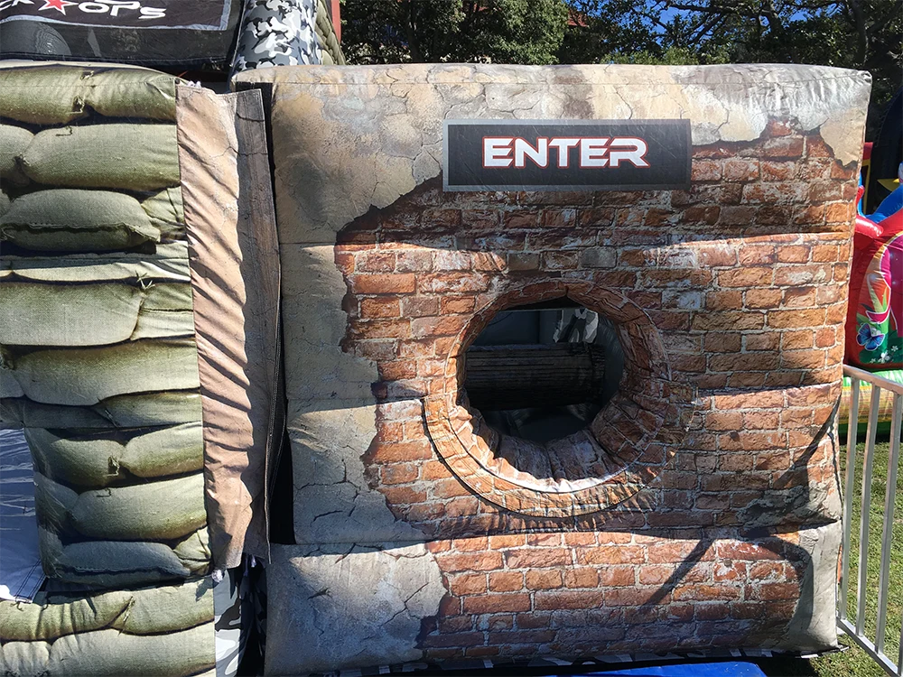 Ready to test your combat skills? The Black Ops Obstacle Course is one of our most challenging obstacle courses ever and will test all participants! Are you ready to be a highly trained combat hero and take on the mission? This dual lane obstacle course is a one of a kind experience allowing the participants to have the feeling that they are truly engaging in a battle of physical stamina. Race your opponent to victory as you make your way through the bricked wall entrance, down the path of stone pillars, crawl-throughs and passageways. The journey doesn’t end here as you reach the rock climb wall leading to the uniquely designed teeter-totter pivoting bridge, then down the slide to the finish line! This fast paced game moves the queues quickly and guarantees to satisfy the biggest crowds for your school fete, sports day or team building event hires.