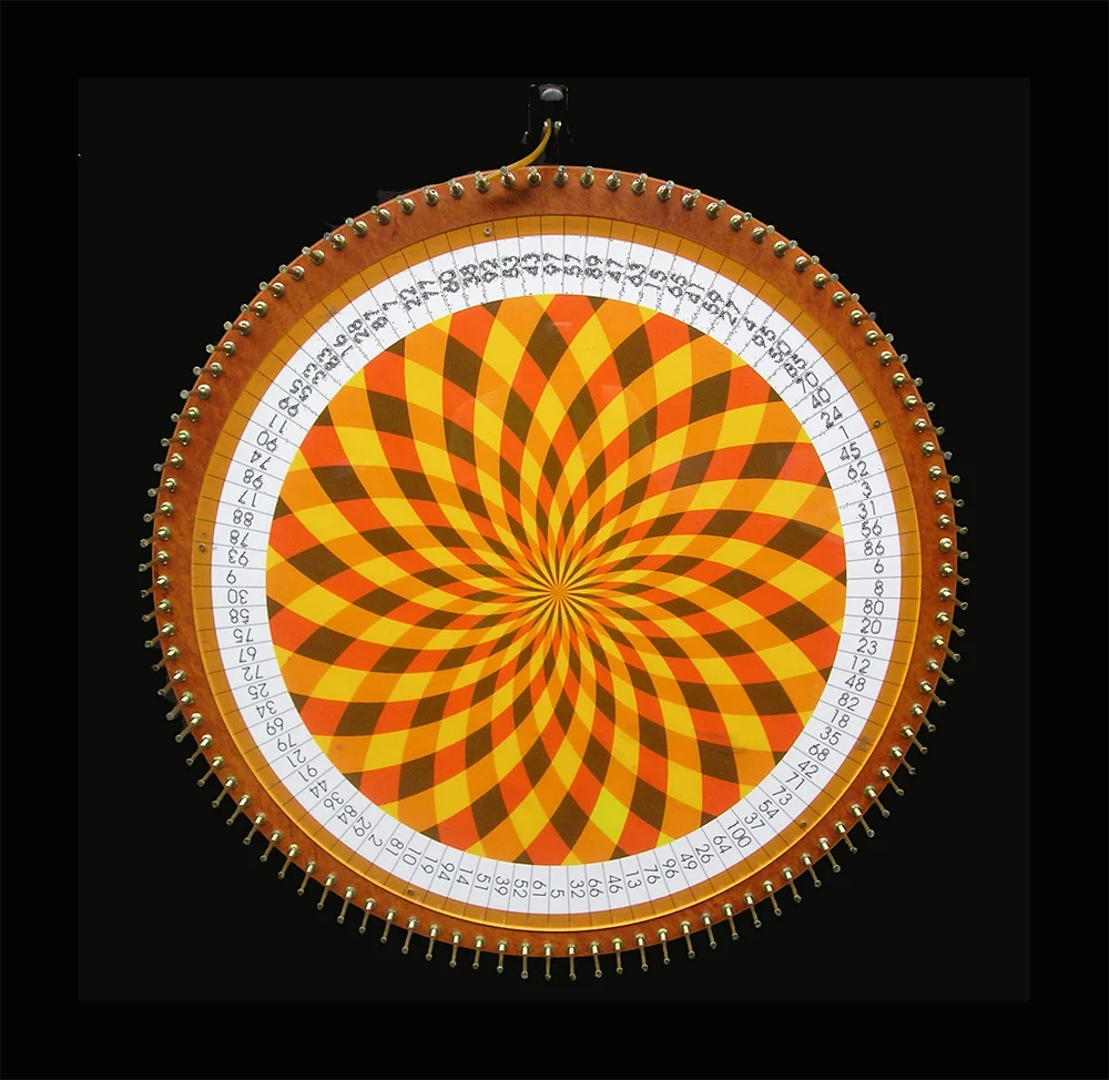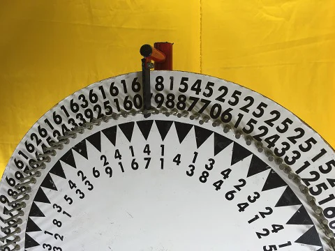 Here we have the Spinning Chocolate Wheel available for hire, a yellow model numbered 1-100.
