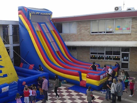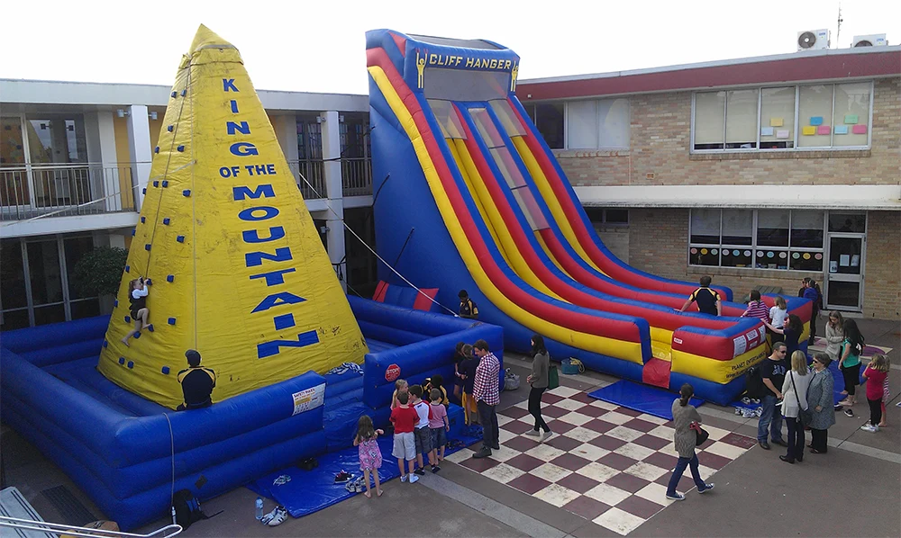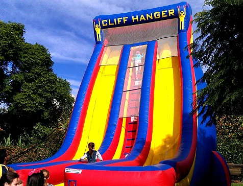 The Cliffhanger dry slide is one of our tallest and steepest giant dry slides for adults and kids over the age of 4. Not only is it a great big colourful spectacle at your school fair, sports presentation or corporate family day, the two slide chutes make it a great people mover to keep the queues down, ticket sales high and keep the guests having maximum fun! Our operators will oversee safety and control the guests, allowing 2 at a time to climb up the towering ladder, then they shuffle out and hold onto the cliff rope before taking the drop down the adrenaline pumping slides. This is not for the faint hearted, expect to feel your stomach drop as you take the plunge and let go of the Cliffhanger!