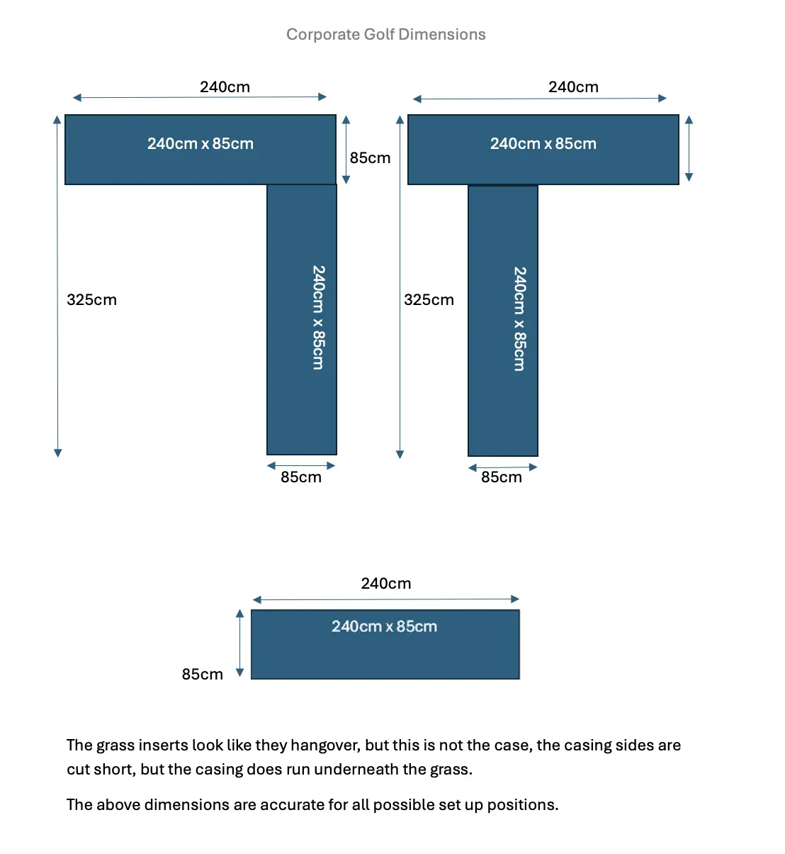 Space required | Single hole greens are 2.4m (L) x 85cm (W) (see photos for more detail) |