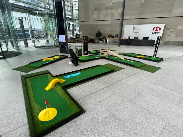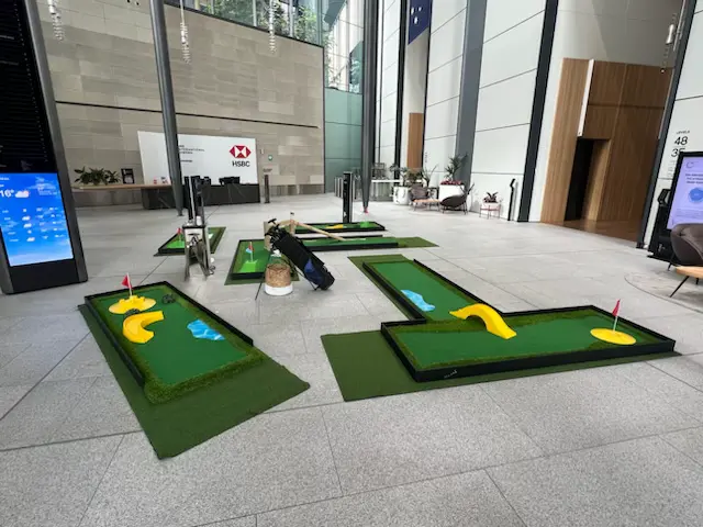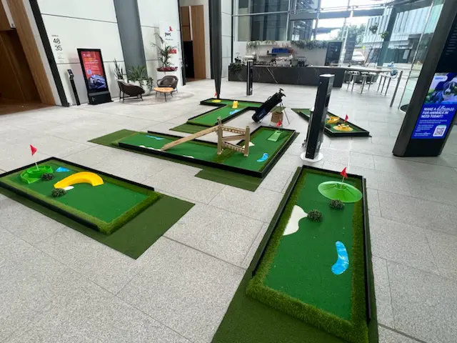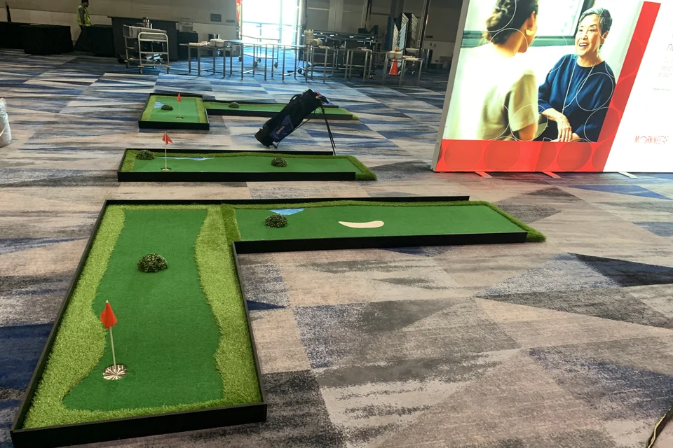 Everyone loves to play Mini Golf or challenge their friends to a few friendly holes of golf, and now you can do it almost anywhere you like! This set of mini-golf is perfect for corporate events, staff bonding, or any event or promotion where presentation is key. Each hole comes with authentic-looking grass and obstacles to make them a little more challenging. With no power required, you can set this up anywhere within a few minutes and start putting! The set can be placed indoors, such as in a shopping centre, office building or convention centre, OR outdoors, in a public space, garden, or school playground. This Mini Golf is perfect for trade show promotions - hire one hole or hire the whole course! It's perfect for a promotion in which players can score and win as individuals or as a team, for an ideal team-building event. We can provide scorecards and pencils to give your mini golf that authentic look and as a great way for your players to keep score. Branding opportunities exist to put your logo or message on the side of each green.