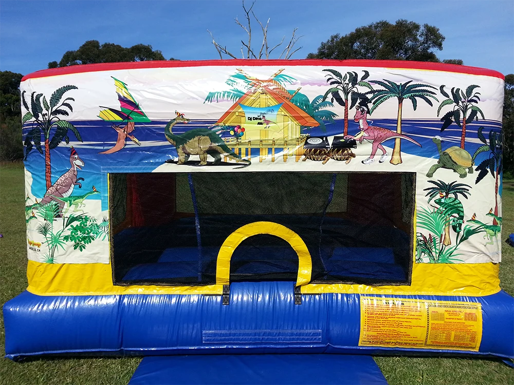 The Dino Party castle has been specially made to suit indoor or outdoor venues with a lower roof system, so weather and space restrictions can’t stop this party! It also features enclosed sides so smaller children won’t fall out or run off, meaning that our supervisors or the watchful parents are always covered! This bright and fun simple castle is suitable for toddlers through to 7 year olds and is often hired as a separate item for the smaller kids at corporate family days or sport presentations.