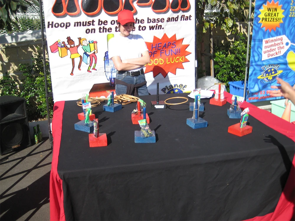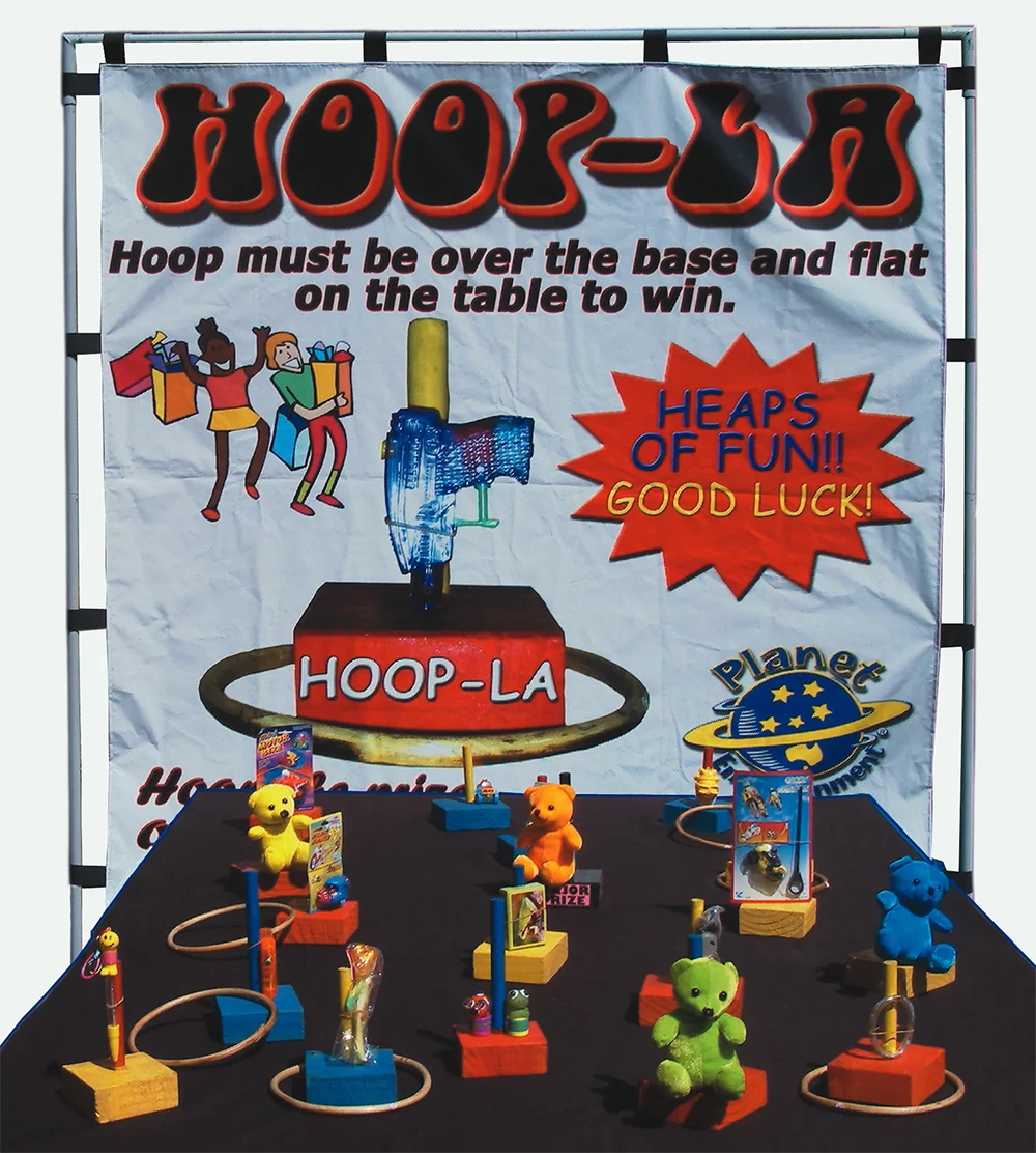 Hoopla is a great sideshow attraction ideal for school fetes and fundraising events. This timeless Hoop-A-Prize game is very easy, throw the hoop over a peg prize to win. Sounds easy, right? The hoop must be completely over the prize and flat on the table to win if you want to make the challenge harder as hoops and bases vary in size! This game can be easily customised to suit your rules or creative ways to use the equipment and backdrop for promotional purposes. A game like this is similar to the Duckpond or Froggy Fly Fling for small kids, yet the Hoopla offers plenty of fun and challenge for all ages.