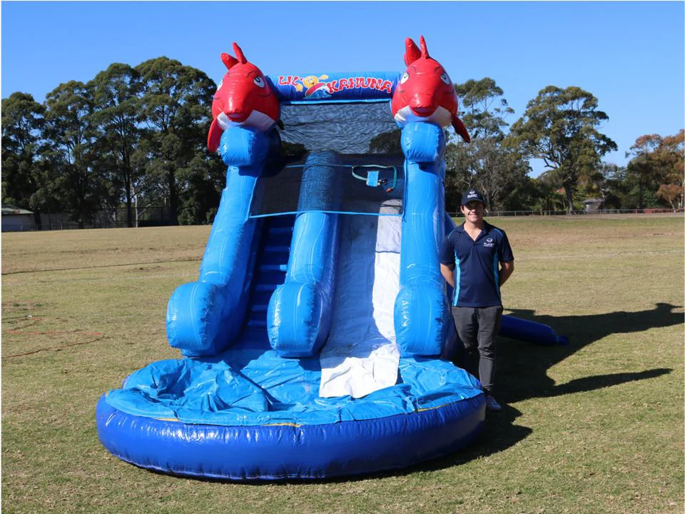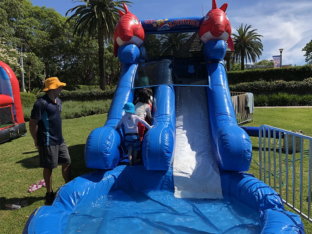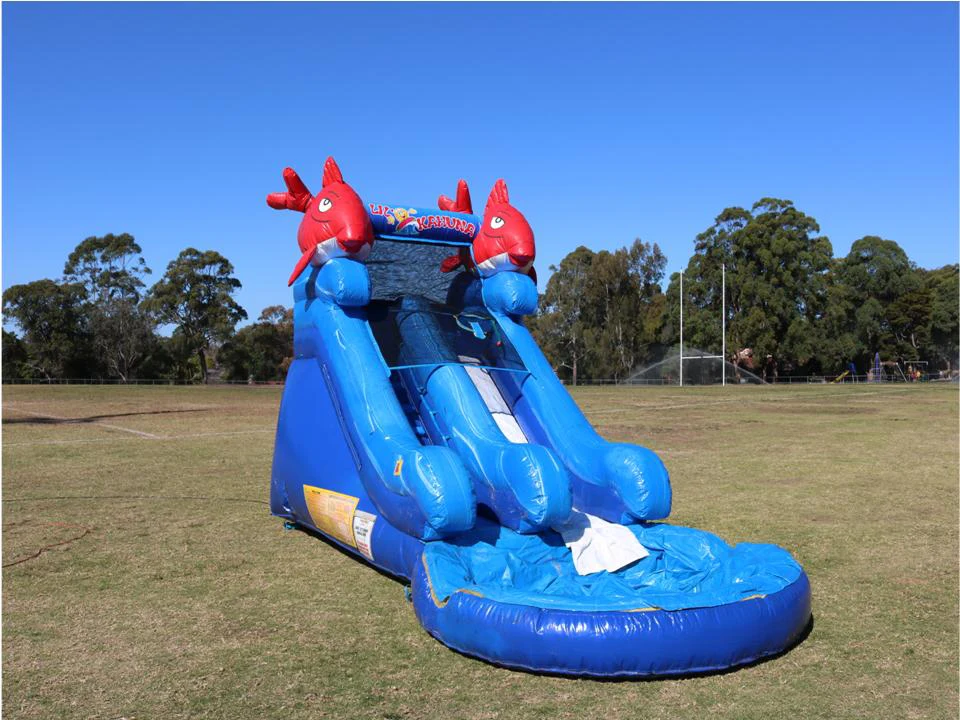 Waterslide Installation: The Lil Kahuna can be easily transported on a wheeled trolley so you can get it into your backyard. Make sure you have access to a water tap to keep the slide slicked and the little pool filled with water. Very easy to hire on a DIY basis or have Planet Entertainment deliver and operate it for an additional fee which includes our Public Liability cover.