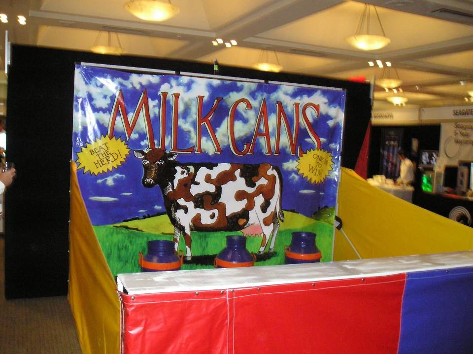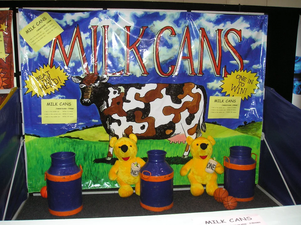 How To Play: Each player gets 3 balls. Land a ball in one of the milk cans to win a prize.