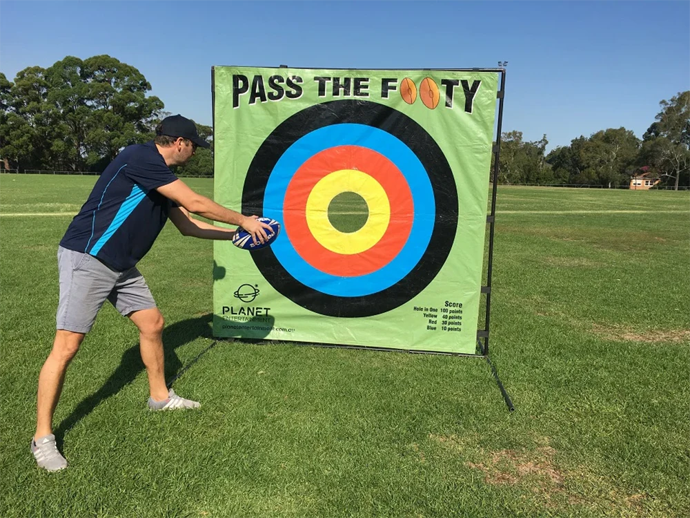 If you are hosting a sports-themed event and looking for other attractions to compliment the Pass the Footy game then check out our Dual-Lane Horizontal Bungee, Rugby Rumble Obstacle Course, and the Try Scorer Horizontal Bungee.