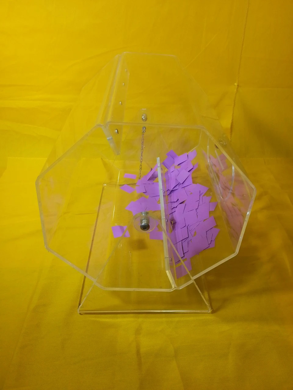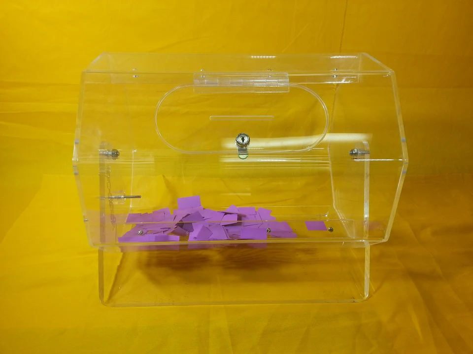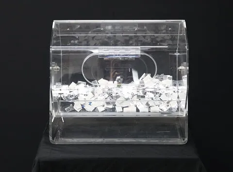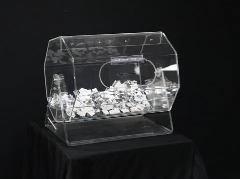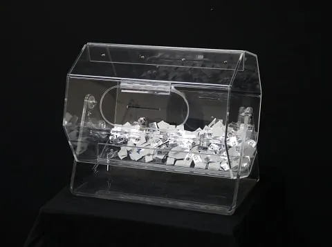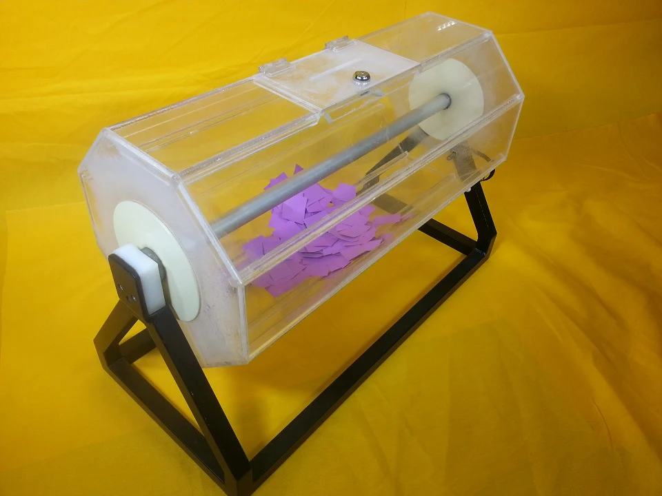 For the smaller promotion or classroom or office competition, the table standing raffle barrel is capable of holding a few hundred standard entries. The barrel spins and has lockable access slots to fish out the winning drawer.