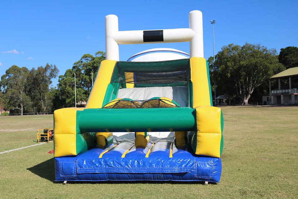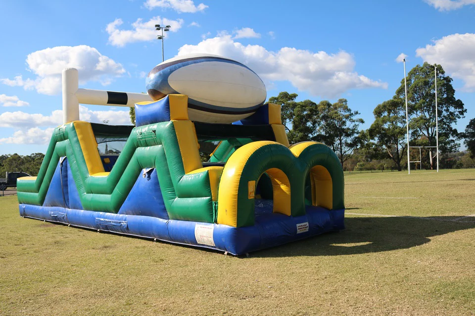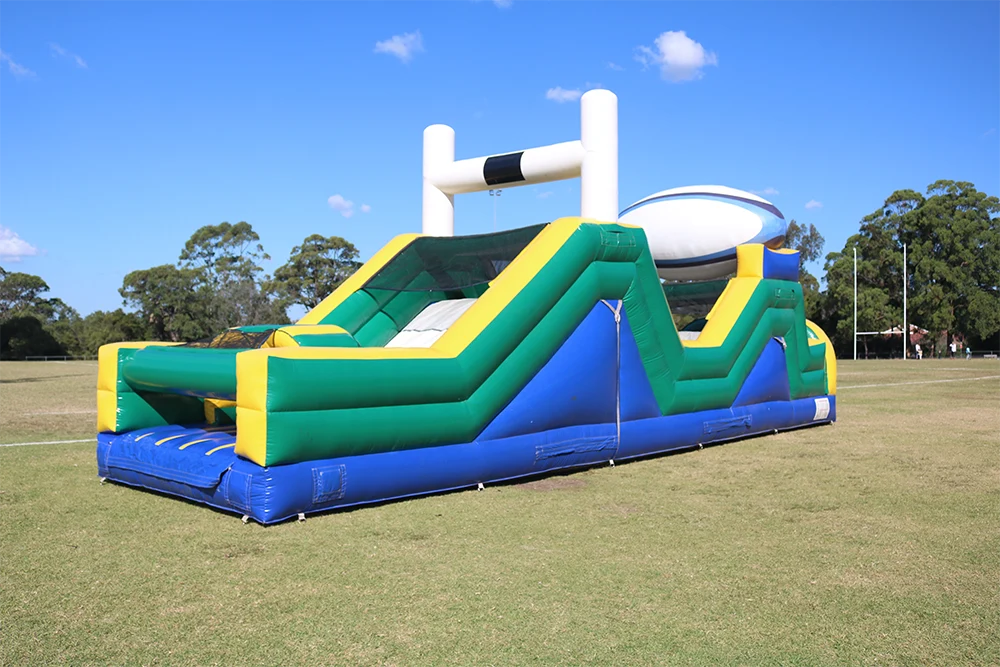 Touch…Pause..Engage! Pack ‘em in with the exciting Rugby Rumble. This all ages ride is capable of taking large volumes of people very quickly with its dual player entry and it will be the ideal obstacle course for your next event at sports games or school fairs. Watch and cheer as your teammates, colleagues and friends challenge their way through this inflatable obstacle course and dive for the big finish to exit. You enter in through tunnels, battle up and down hills, smash and tackle through biff bash podiums and squeeze out through the squeeze tubes.