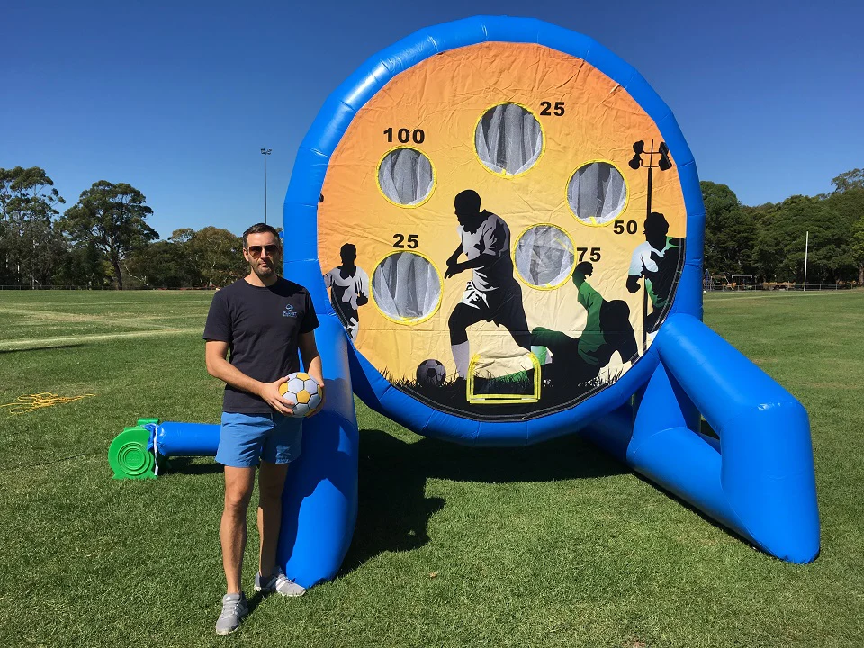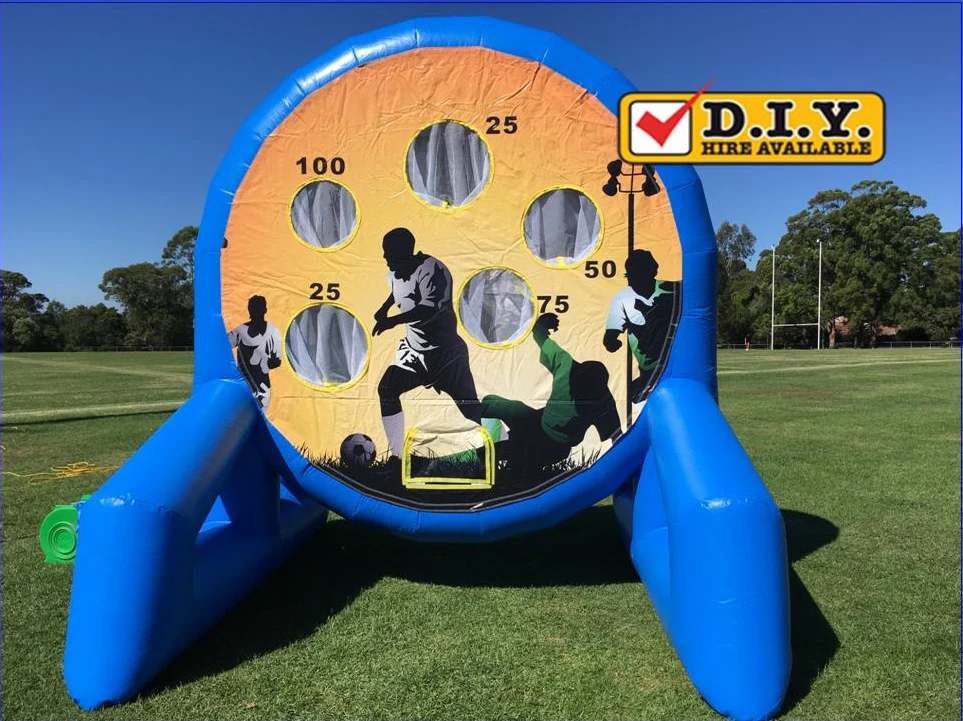 Ride Setup: This game is available as a DIY hire or we can provide staff to operate the game. This game requires 1 x standard power point for the blower used to inflate the game and we will provide the special velcro soccer balls that accompany it.