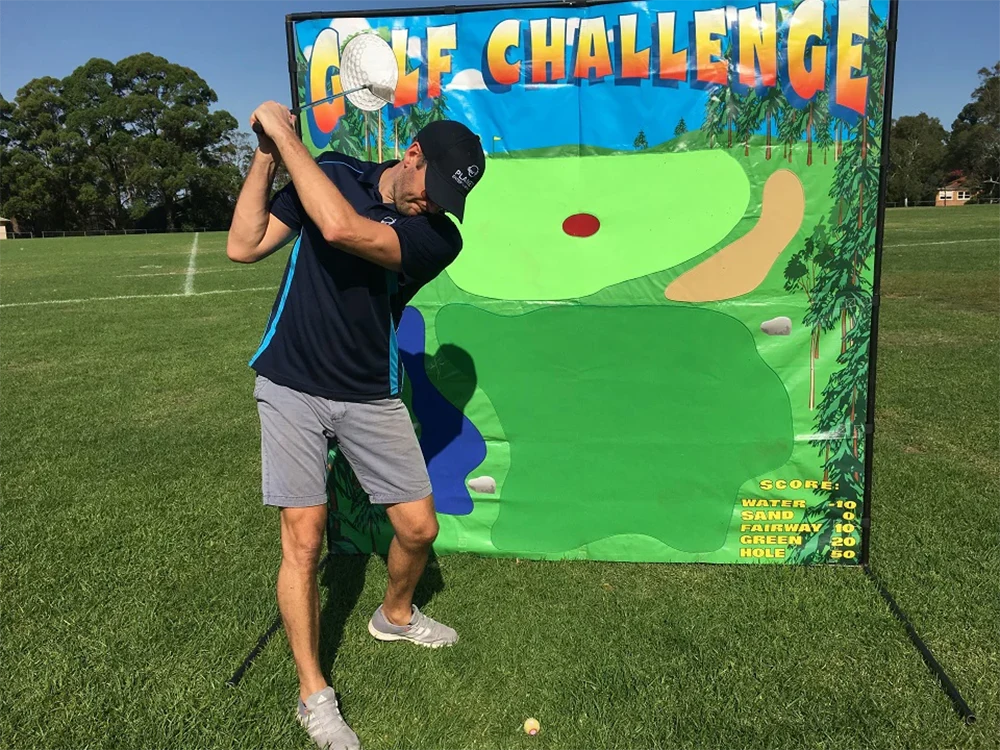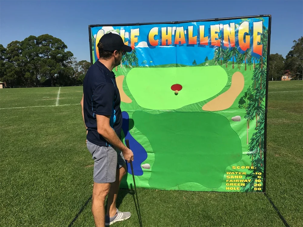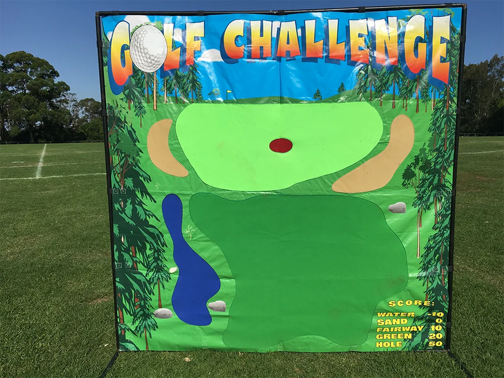 Watch those water hazards! Velcro Golf is a unique way to play a round of golf at your next event. Perfect for trade shows and team building, this item allows people of all ages to challenge their friends and test their swing. Includes left and right handed clubs. This item is perfect for DIY hire and is incredibly easy to setup.